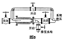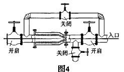 直筒籃式過濾器可安裝在水平管段或者垂直管段上。為方便清洗可做成可反沖直筒籃式過濾器組,圖4為該過濾器組日常運行模式圖。圖5為該過濾器組沖洗運行模式圖。