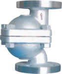 工作原理 立式自由浮球式蒸汽疏水閥的結構簡單,內部只有一個精細研磨的不銹鋼空心浮球,既是浮子又是啟閉件,無易損零件,使用壽命很長。裝置剛起動時,管道內出現空氣和低溫冷凝水,雙金屬自動排空氣元件把浮球推離閥座,閥門打開,排除不凝結氣體,低溫冷凝水流進疏水閥,浮球上升,凝結水迅速排放。裝置很快提升溫度,管道內溫度上升到飽和溫度之前,雙金屬自動排空氣元件感溫變型伸直;蒸汽疏水閥進入正常運行狀況,浮球隨液位升降調節閥孔流量;當凝結水停止進入時,浮球隨介質流向逼近閥座,關閉閥門。立式自由浮球式蒸汽疏水閥的閥座總處于液位以下,形成水封,無蒸汽泄漏。 |